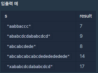 예를 들어, "ababcdcdababcdcd"의 경우 문자를 1개 단위로 자르면 전혀 압축되지 않지만, 2개 단위로 잘라서 압축한다면 "2ab2cd2ab2cd"로 표현할 수 있다. 다른 방법으로 8개 단위로 잘라서 압축한다면 "2ababcdcd"로 표현할 수 있으며, 이때가 가장 짧게 압축하여 표현할 수 있는 방법이다.