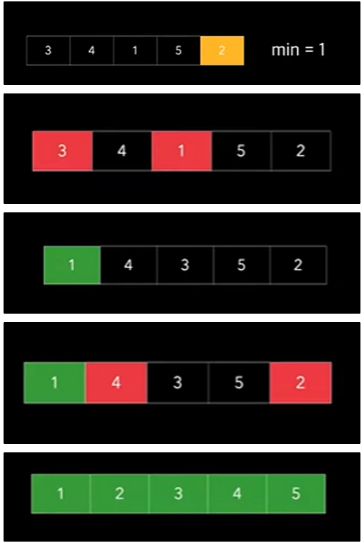 - 전체 범위에서 차례대로 가장 작은 숫자를 탐색하고 가장 왼쪽부터 차례대로 교환하는 방식