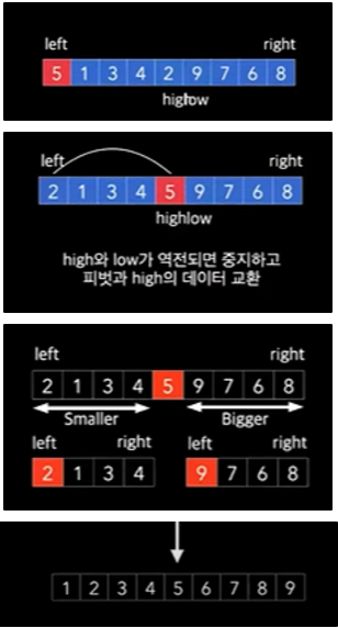 - 다른 정렬 알고리즘보다 효율적이고 빨라 퀵 정렬이라고 한다.