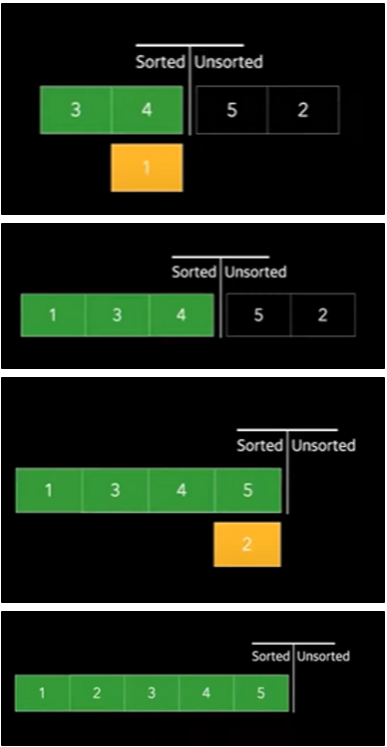 - 모든 요소를 앞에서부터 차례대로 이미 정렬된 배열부분과 비교하여 자신의 위치를 찾아 삽입하는 방식