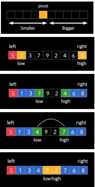 - 특정요소를 기준점으로 잡고 기준점보다 작은 요소는 왼쪽, 큰요소는 오른쪽, 왼쪽과 오른쪽을 각각 정복하는 방식