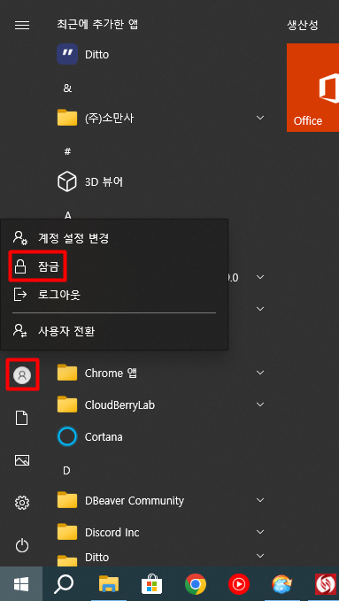 왼쪽 하단에 있는 윈도우 시작 버튼을 눌러서 [계정] 버튼을 클릭하면 [잠금] 버튼이 나타나는데 그 버튼을 클릭하면 화면이 잠긴다.