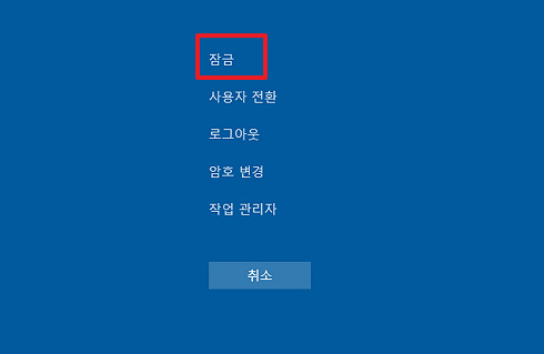 키보드로 Ctrl + Alt + Del 버튼을 동시에 누르면 위와같은 화면이 나오는데 거기 서 [잠금] 버튼을 눌러서 잠금모드 할 수 있다.