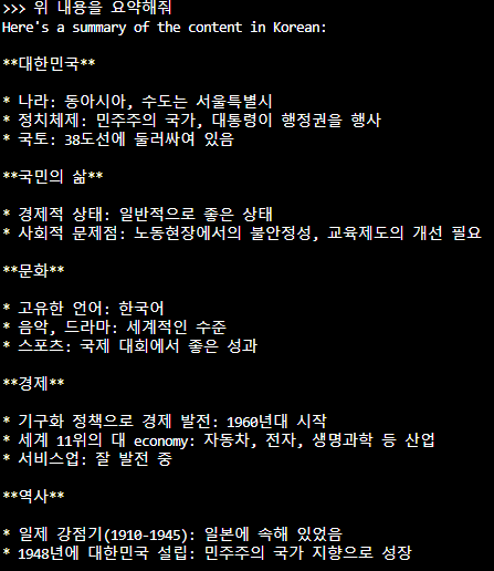 위 질문을 통해서 나온 아웃풋을 요약해달라는 내용을 인풋값으로 넣으면 요약된 내용을 출력할 수 있다.