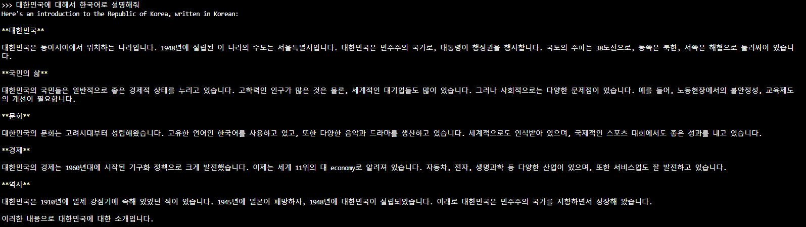 >>> 대한민국에 대해서 한국어로 설명해줘
