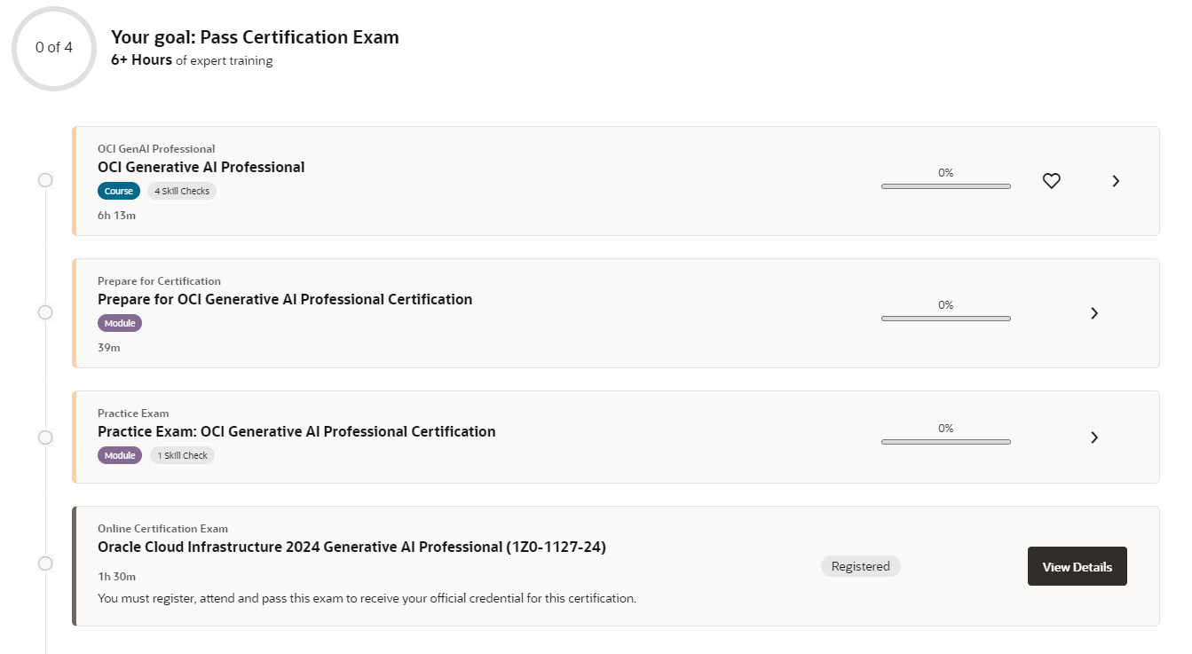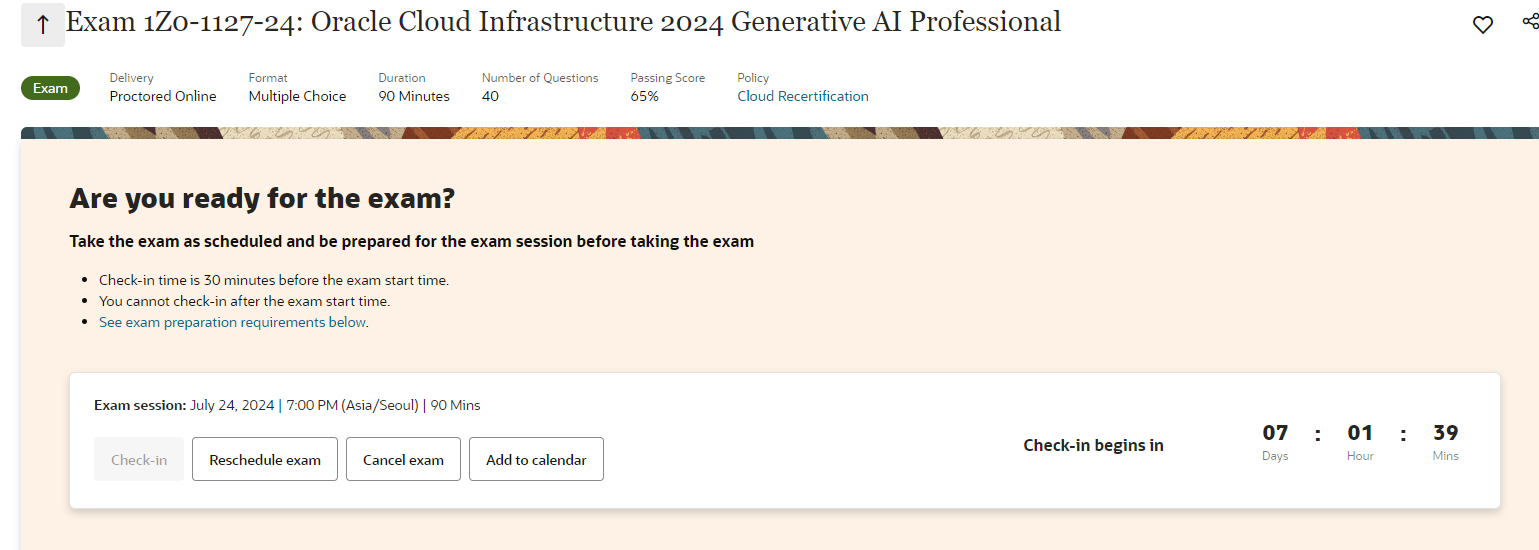 ( https://learn.oracle.com/ords/training/dl4_activation.activateOrder?key=BE175977FC4529C7&destination=https://mylearn.oracle.com/ou/learning-path/become-a-oci-generative-ai-professional/136227 ) - 시험 응시 : OCI 2024 Generative AI Professional Certification Exam