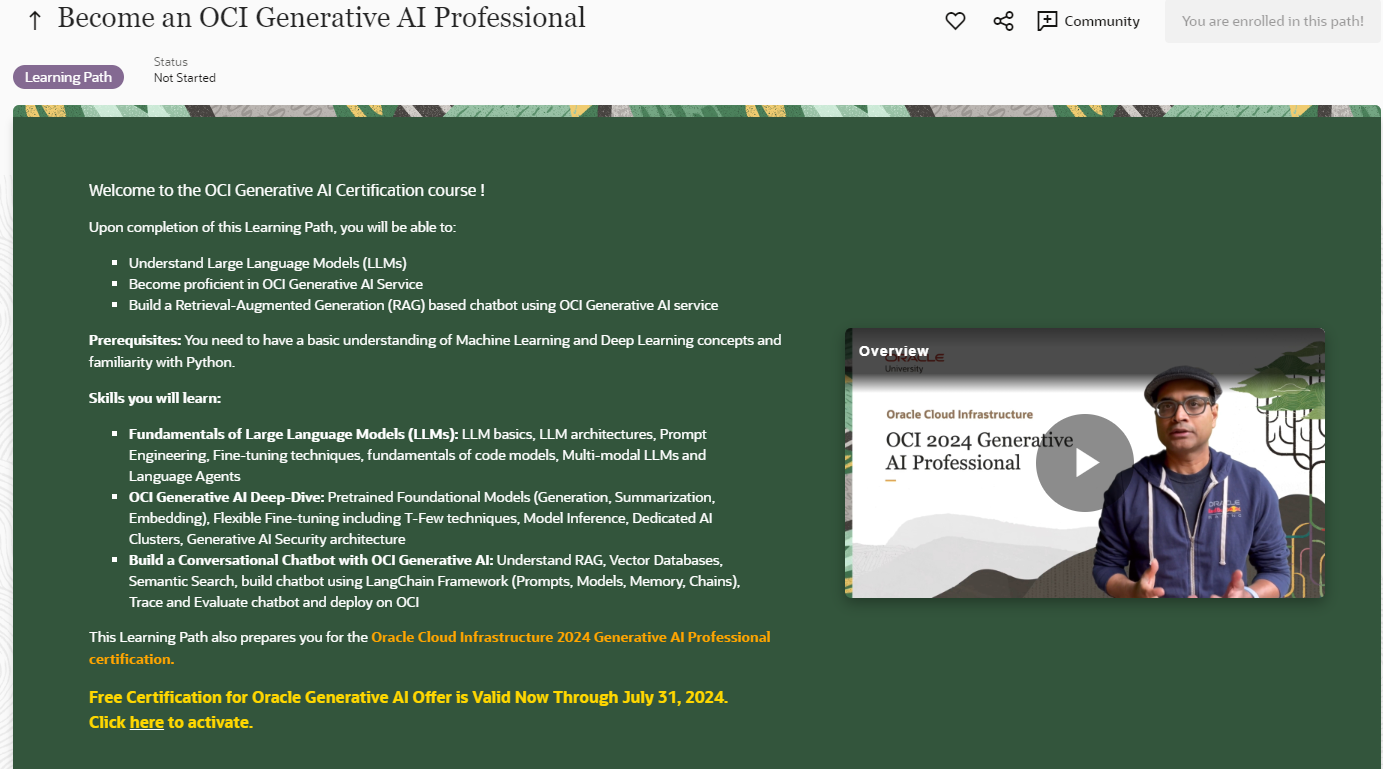 2024년 7월 31일까지 OCI 2024 Generative AI Professional 강의 및 자격증을 무료로 듣고 취득할 수 있음