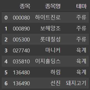 '테마' : ['주류', '주류', '주류', '육계', '육계', '육계', '돼지고기']}