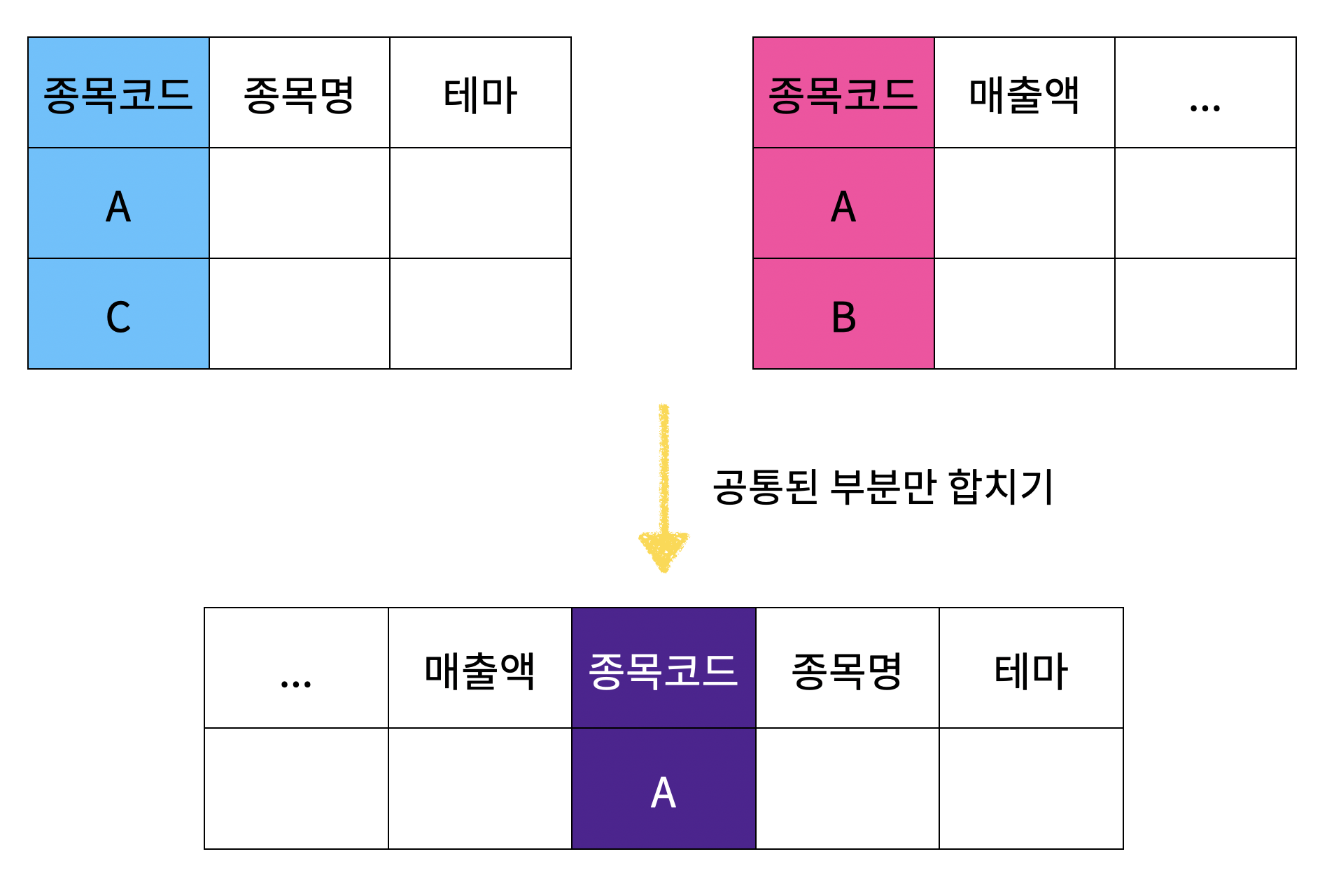 새롭게 만들려고 하는 과정을 자세히 보면, 종목(종목코드) 를 기준으로 합친다는 것을 알 수 있다.