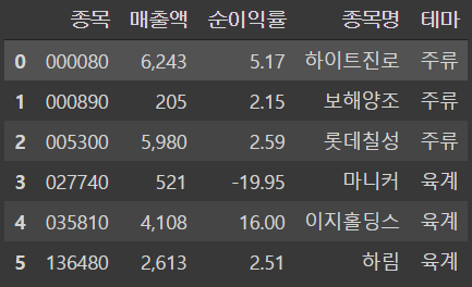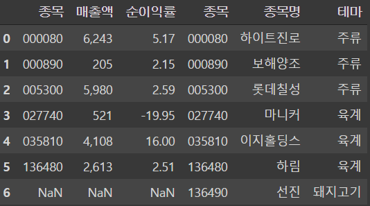 df = df.merge(df2, how = 'inner', on = '종목')