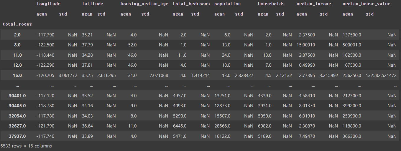 total_rooms으로 그룹별 계산(mean, std, max, min)