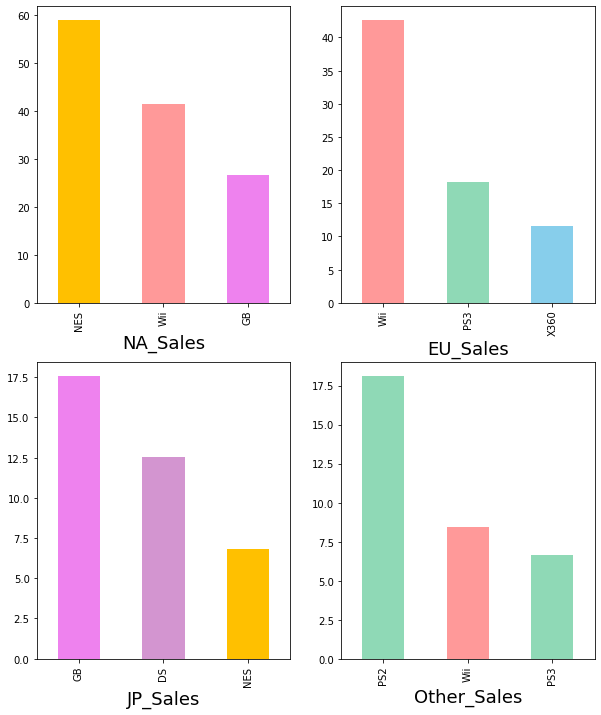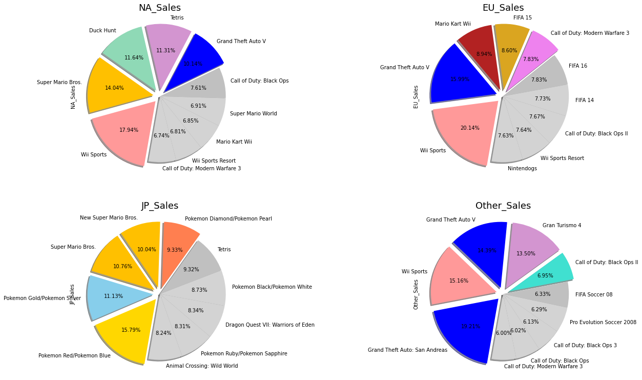 - 지역별 출고량이 높은 게임을 시각화 하고 출고량이 높은 top3의 게임에 대한 platfrom 조사(파이차트)