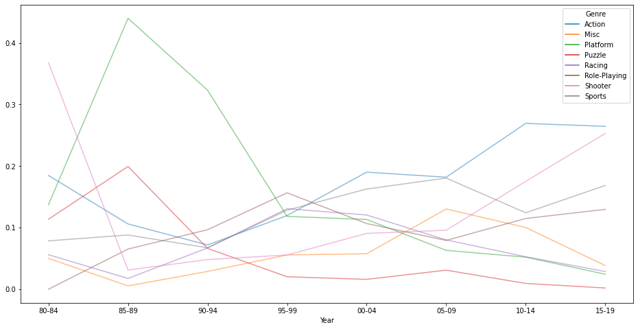 - 1990 - 2010 : 'Platfoom'장르가 줄어들면서 'Action'과 'Sports'장르가 상승