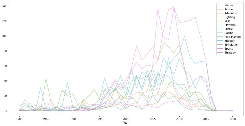 ▷ 시간에 따른 장르별 판매량의 차이가 있을까?(line차트)