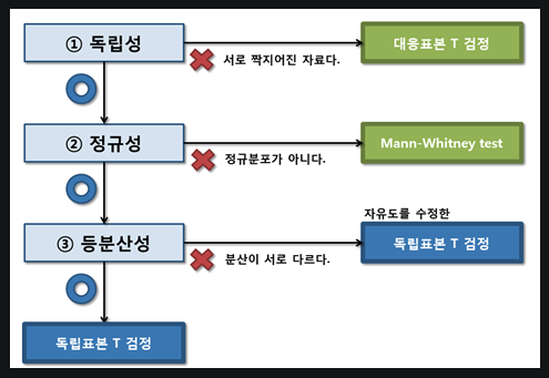 T- 검정은 모집단의분산이나표준편차를 알지 못할 때, 표본으로부터 추정된 분산이나 표준편차를 이용하여 두 모집단의 평균의 차이를 알아보는 검정 방법이다. 집단의 수는 최대 2개까지 비교 가능하며 3개 이상인 경우 분산분석(ANOVA)를 사용한다.