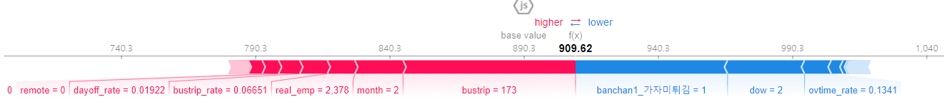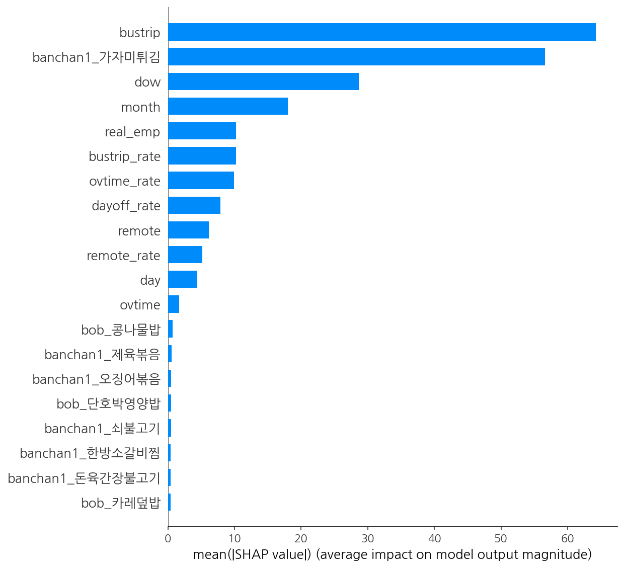 - 특성 중요도가 높으면서 higher 변수는 bustrip이고 다음으로 lower변수인 반찬으로 가자미튀김이 나오면 점심을 잘 안먹는 인사이트를 도출할 수 있었다.