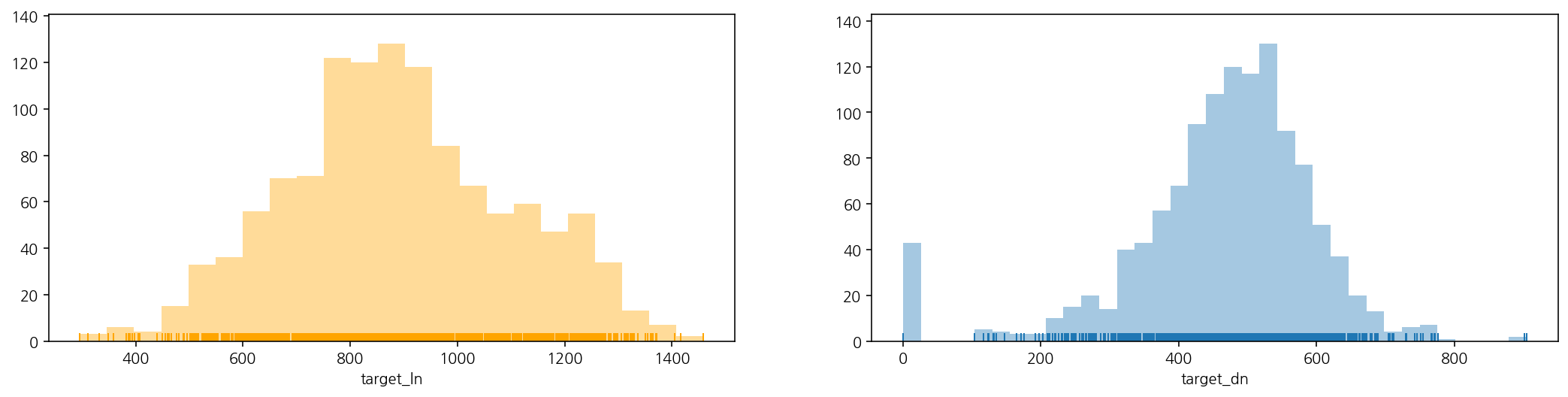 sns.distplot(train_eng["target_dn"], ax = ax[1], kde = False, rug = True)