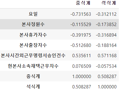 x_train = train[['요일', '본사정원수', '본사출장자수', '본사시간외근무명령서승인건수', '현본사소속재택근무자수']]