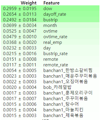 두 중식, 석식 머신러닝 모델 중 더 분포가 다양하고 예측하기 어려운 중식데이터만 가지고 모델의 특성중요도를 알아보았습니다.