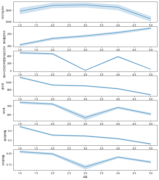 - 요일에 따른 중식, 석식 식사량에 차이가 있을까?