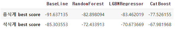 - 점심 베이스라인 모델 성능 : -91.67910737123546