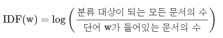 TF-IDF(Term Frequency-Inverse Document Frequency)는 이렇게 다른 문서에 등장하지 않는 단어, 즉 특정 문서에만 등장하는 단어에 가중치를 두는 방법이다.