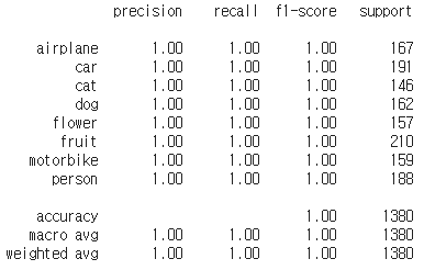 8개의 범주로 분류되어있는 10000개가 넘는 이미지 데이터를 100%에 근접하는 확률로 예측하는 모델을 만드는데 성공