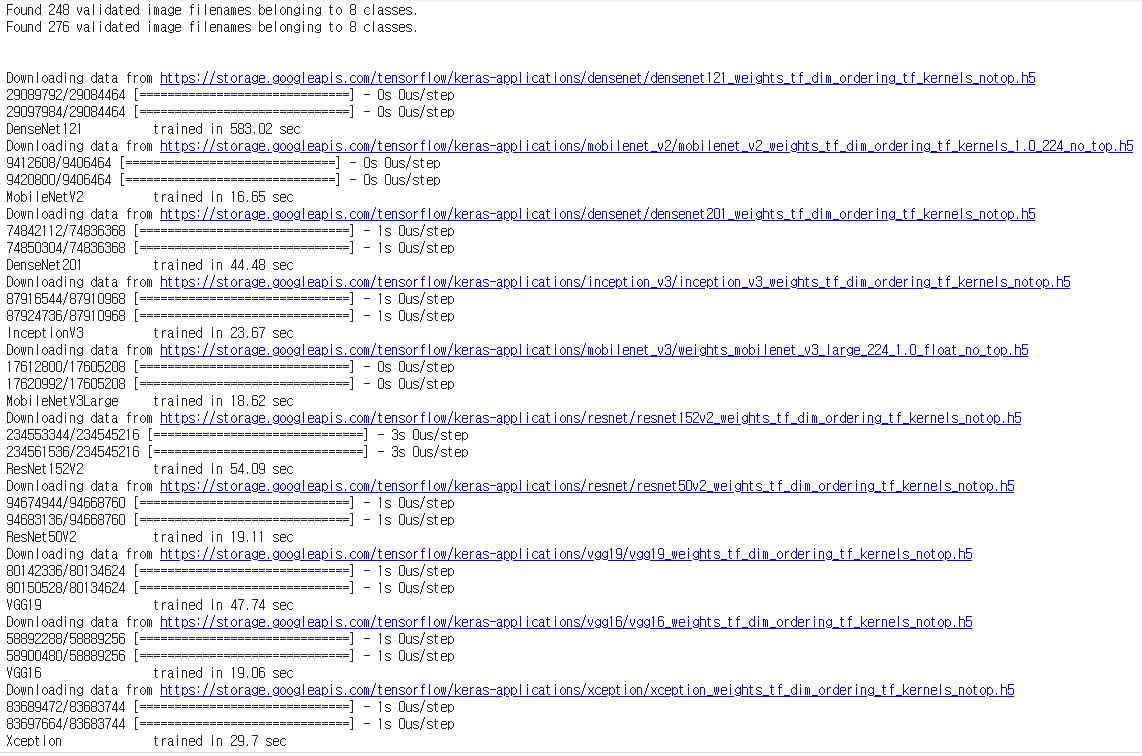 VGG19모델처럼 시간만 오래걸리고 성능은 좋지못한 모델이 있기 때문에 가장 좋은 성능을 내고 시간도 적게 드는 Densenet201과 resnet152v2를 통해서 다시 성능을 확인해보았다.