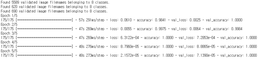 다음으로는 resnet모델을 학습했습니다. 5에포크로 학습을 진행했고 2에포크에서 정확도는 1을 로스는 0에 수렴했다.