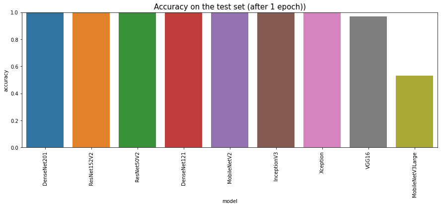 plt.title('Accuracy on the test set (after 1 epoch))', fontsize = 15)