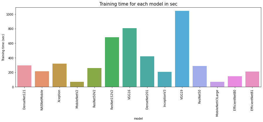 plt.title('Training time for each model in sec', fontsize = 15)
