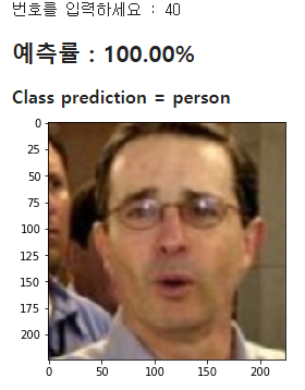 번호를 입력하면 번호에 대한 이미지가 나오고 그 이미지에 대해서 예측 라벨을 출력하는데 위의 결과를 보면 예측률 100%로 person을 잘 예측하는것을 볼 수 있다.