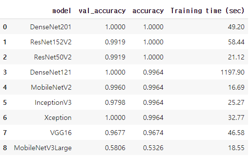 학습한 모델에 test셋을 통해서 전이모델별 성능을 확인했는데 정확도가 대부분 1에 수렴하는 것을 볼 수 있다.