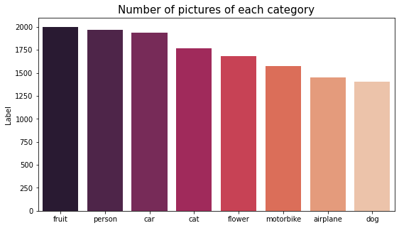 plt.title("Number of pictures of each category", fontsize = 15)