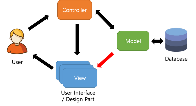 컨트롤러는 뷰(사용자)의 인터랙션을 받아 모델에 전달하고 바뀐 모델 데이터를 뷰에 다시 전달하여 업데이트 하는 중간 역할이다.