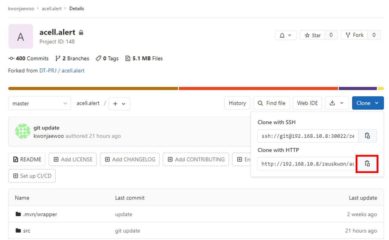 - 개인 계정 원격저장소에서 로컬로 Clone하기 위해 주소복사