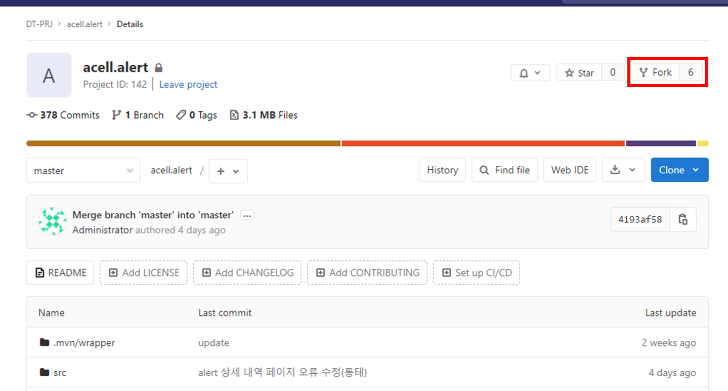 - 중앙 원격 저장소를 개인 계정으로 복사(Fork 버튼 클릭)