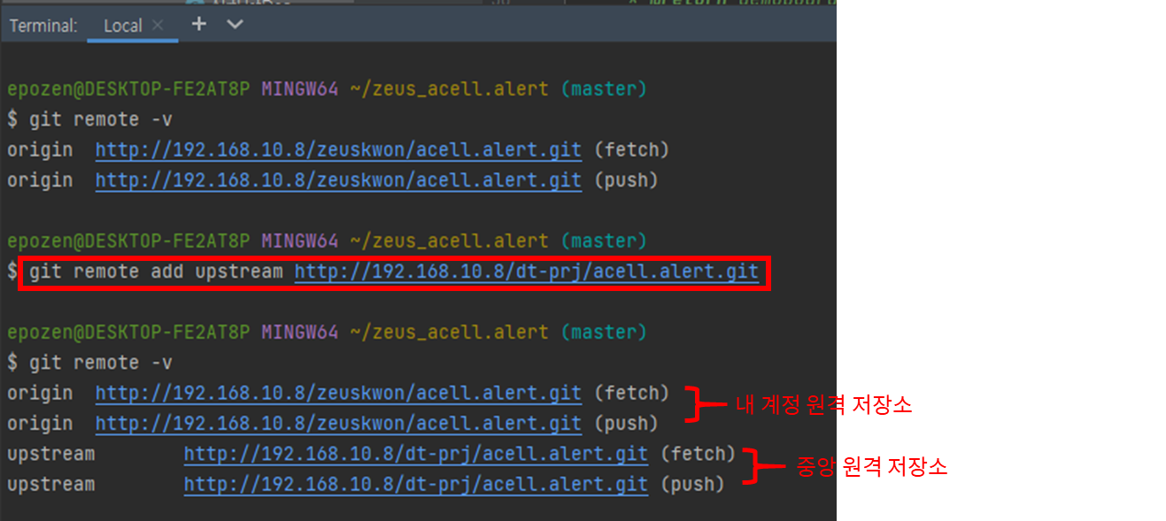 - 로컬에 중앙 원격 저장소 주소 등록 (Remote 등록)