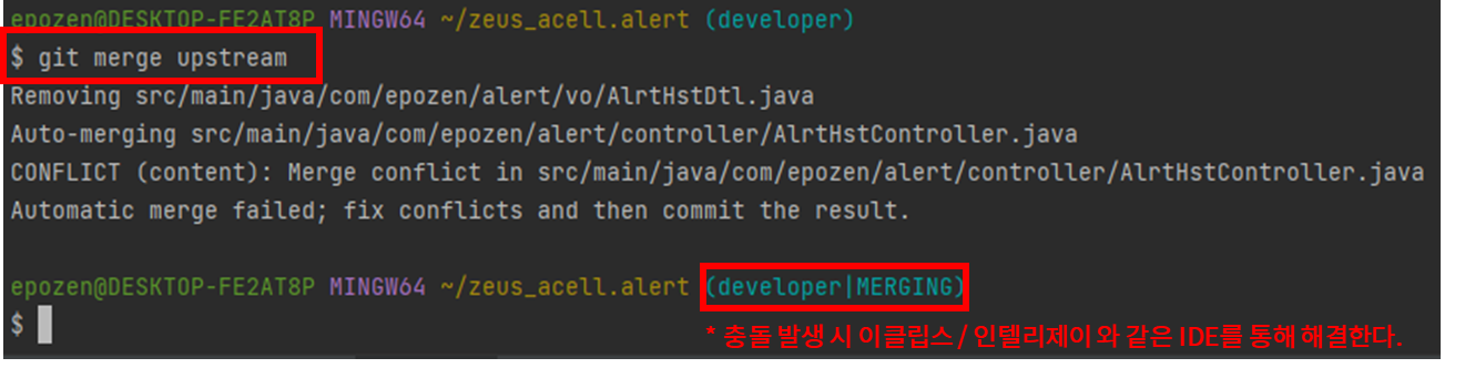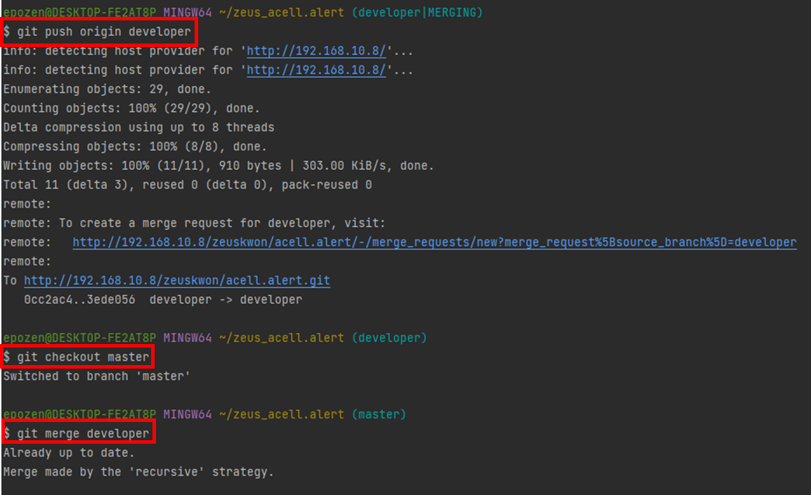 - git checkout master -> git merge developer(develope코드 master에 병합)