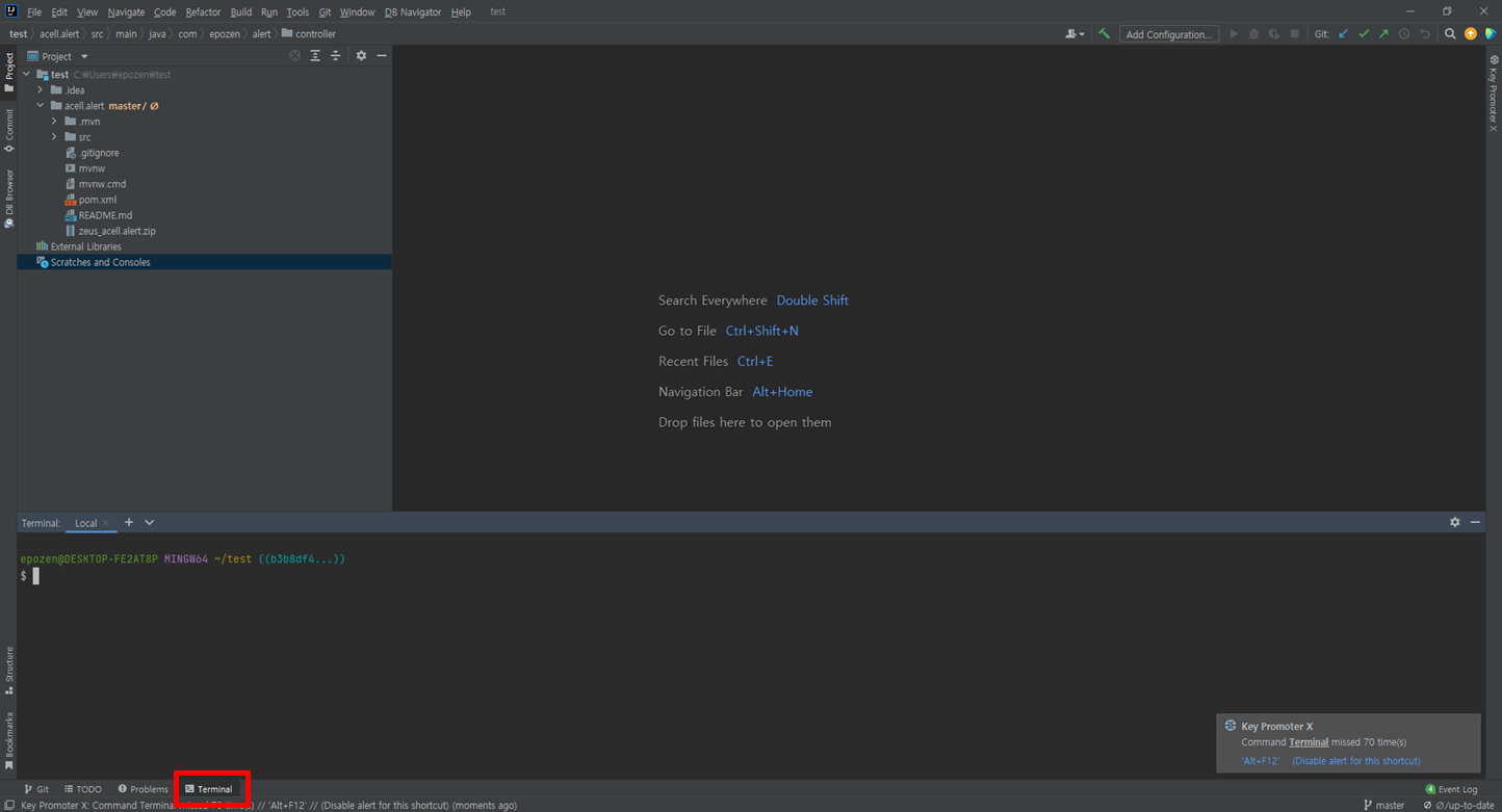 - Open된 프로젝트에서 아래 Terminal 버튼 클릭해서 git bash로 설정하기