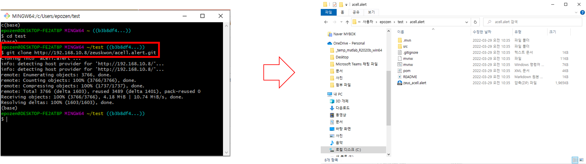 - Git bash에서 작업할 폴더 만들고 복사한 원격저장소 주소로 데이터 가져오기