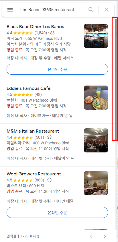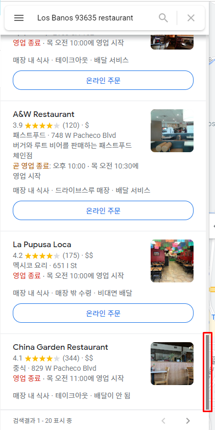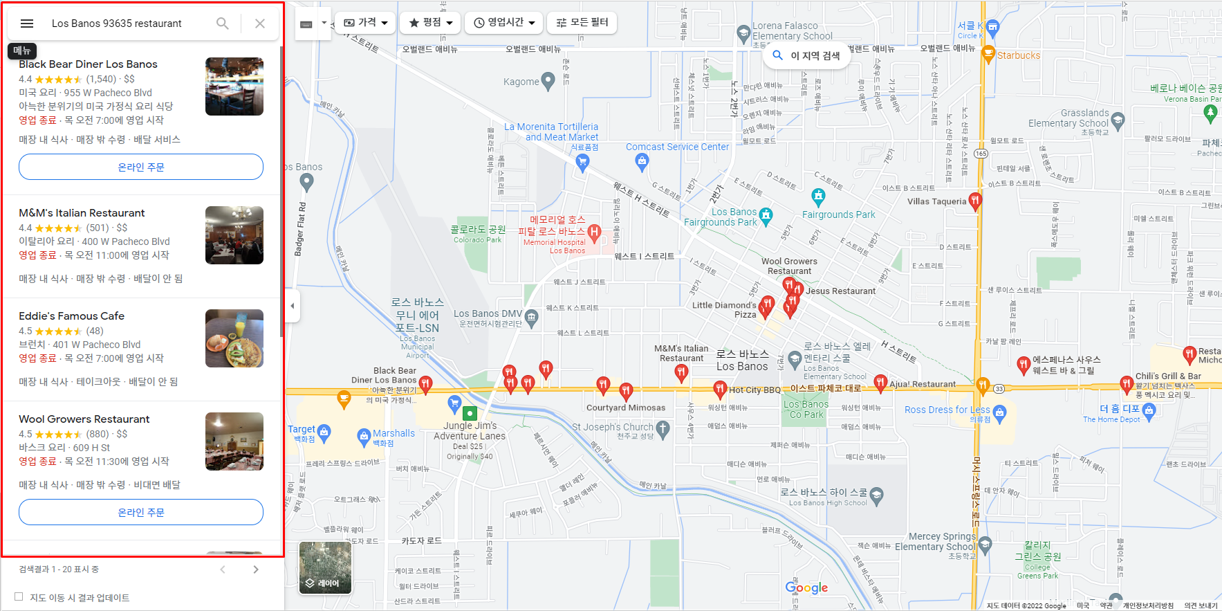 구글맵 검색어 입력 부분에서 Los Banos 93635 restaurant을 검색해본다.