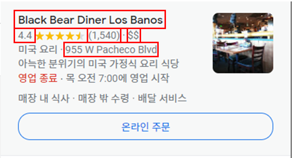 우리는 여기서 매장이름, 별점, 리뷰수, 리뷰 오른쪽 달러($), 주소를 가져오려고 한다.