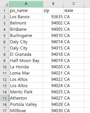 현재 클라이언트로부터 캘리포니아의 po_name(도시이름), zip(지역코드), state(주 이름)을 받은 상태이다. (약 300개)