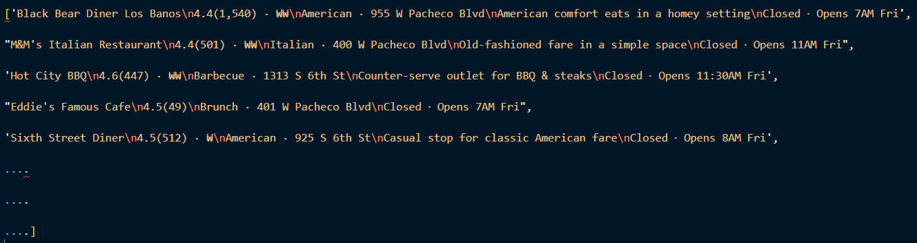 이제 본격적으로 음식점 정보(이름, 별점, 리뷰수, 달러, 주소)를 긁어오는 코드를 작성한다.