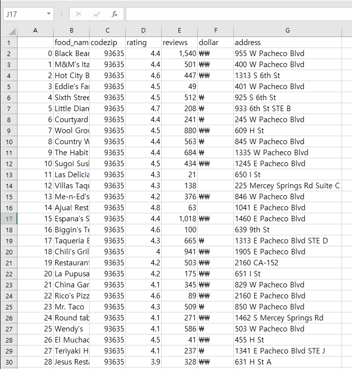 datafram_make(food_name,food_name_code,rating, reviews, dollar, address)