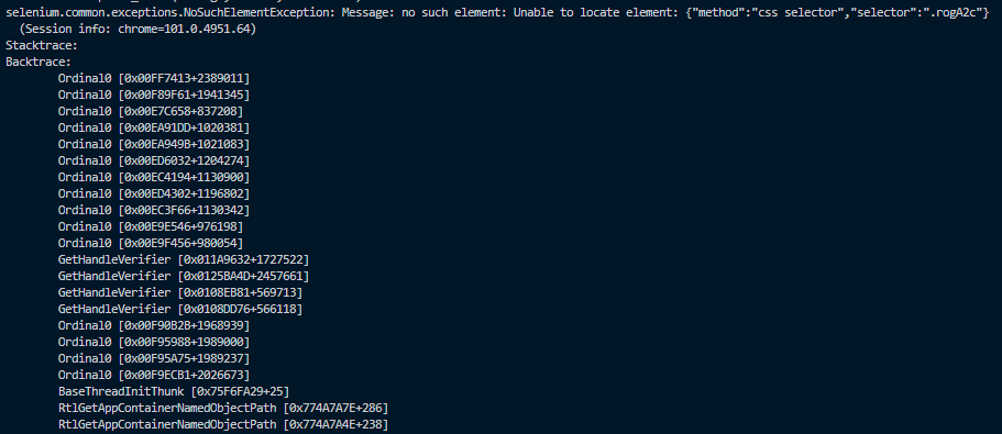 selenium.common.exceptions.NoSuchElementException: Message: no such element: Unable to locate element: {"method":"css selector","selector":".rogA2c"}