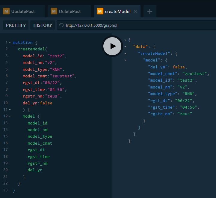 http://127.0.0.1:5000/graphql 로 접속해서 데이터 Create 쿼리 전송